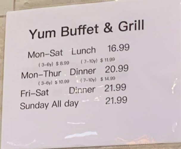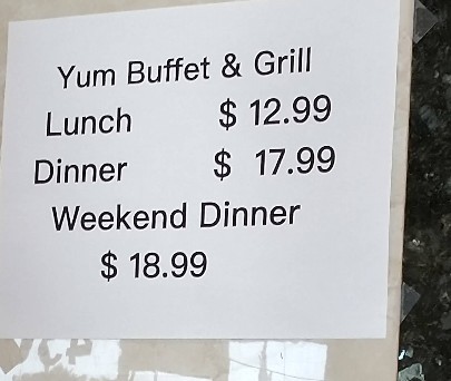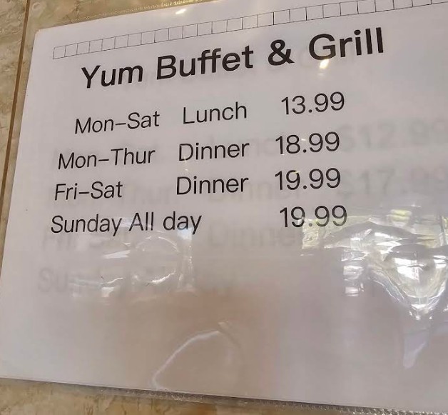 Yum Buffet & Grill is open on Monday, Tuesday, Wednesday and Thursday from 11:00 AM - 9:00 PM; Friday, Saturday and Sunday from 11:00 AM - 9:30 PM.